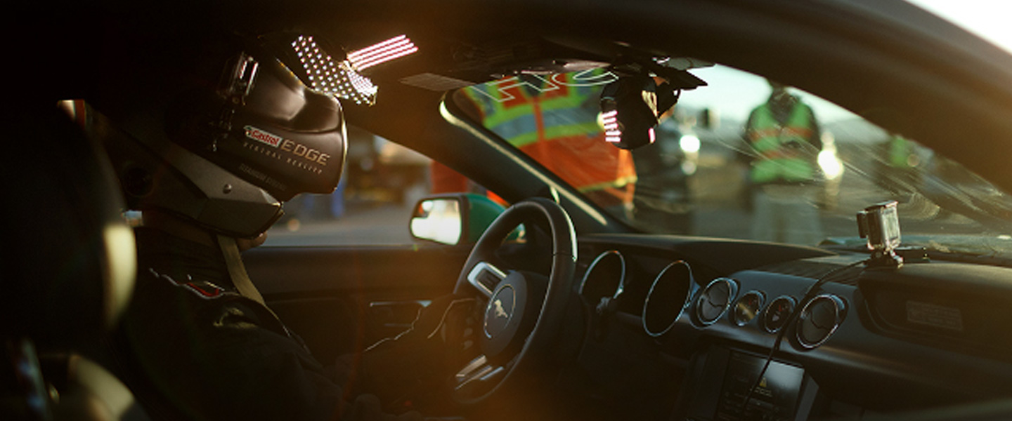 Are cars faster in the virtual world or the real one? To find out, we placed champion Formula Drifter Matt Powers and his 650-horsepower Mustang on a clear open course, before connecting the driver to the Oculus gear. Blinded by the headset but fed images of a virtual obstacle course, Powers had to drive his real car in response to the virtual environment. Powers skillfully maneuvers his way to safely avoiding pitfalls, falling boulders, and monster waves, as the entire virtual world collapses around him. The resulting film shows a harrowing and inventive use of the extraordinary VR technology.