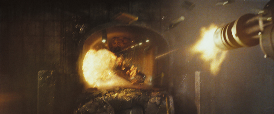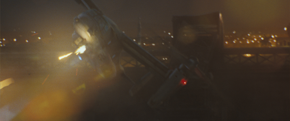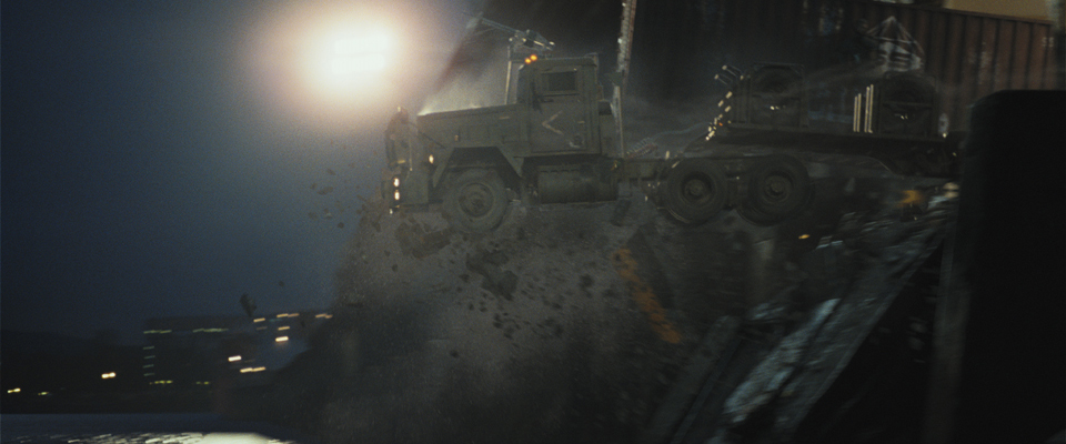 For a key action scene, Digital Domain’s seamless digital environments make it appear that the heroes are in the thick of a battle – even thought close up shots were filmed on a soundstage. The sequence culminates with a tractor-trailer crashing into a rive and V-22 Osprey airlifting it out of the water. These all-CG shots were originally conceived to include live-action elements, but they were ultimately digitally replaced to better integrate with the surrounding CG environment.